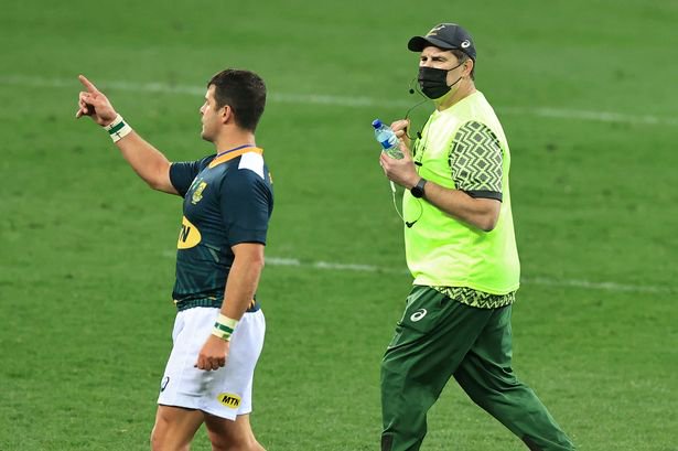Rassie erasmus on ther field during the 2021 international test match rugby series between south africa and georgia at loftus stadium.